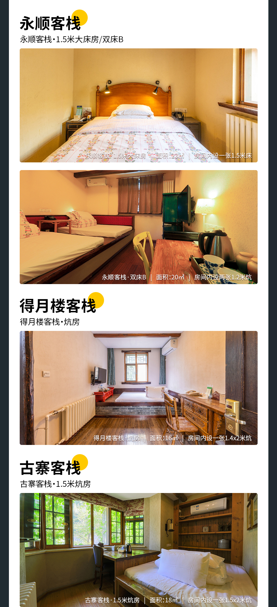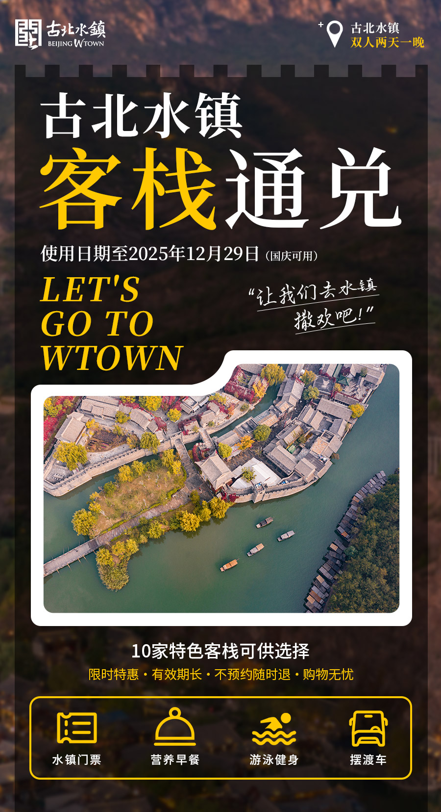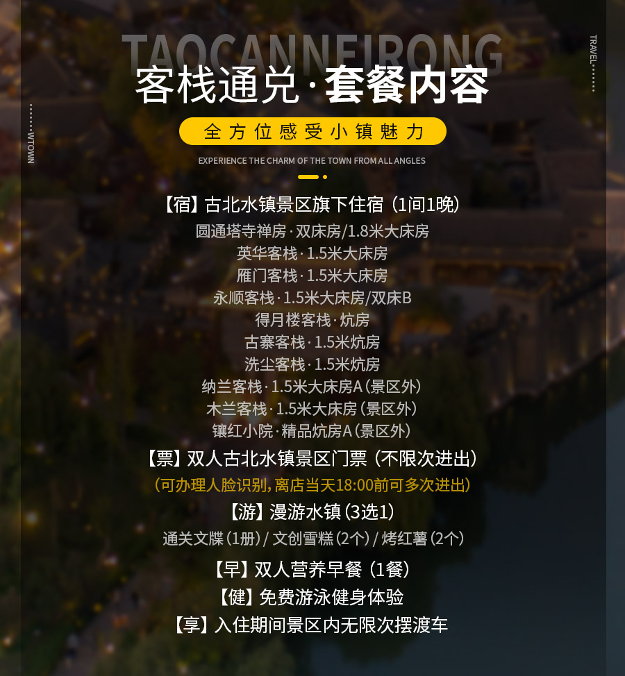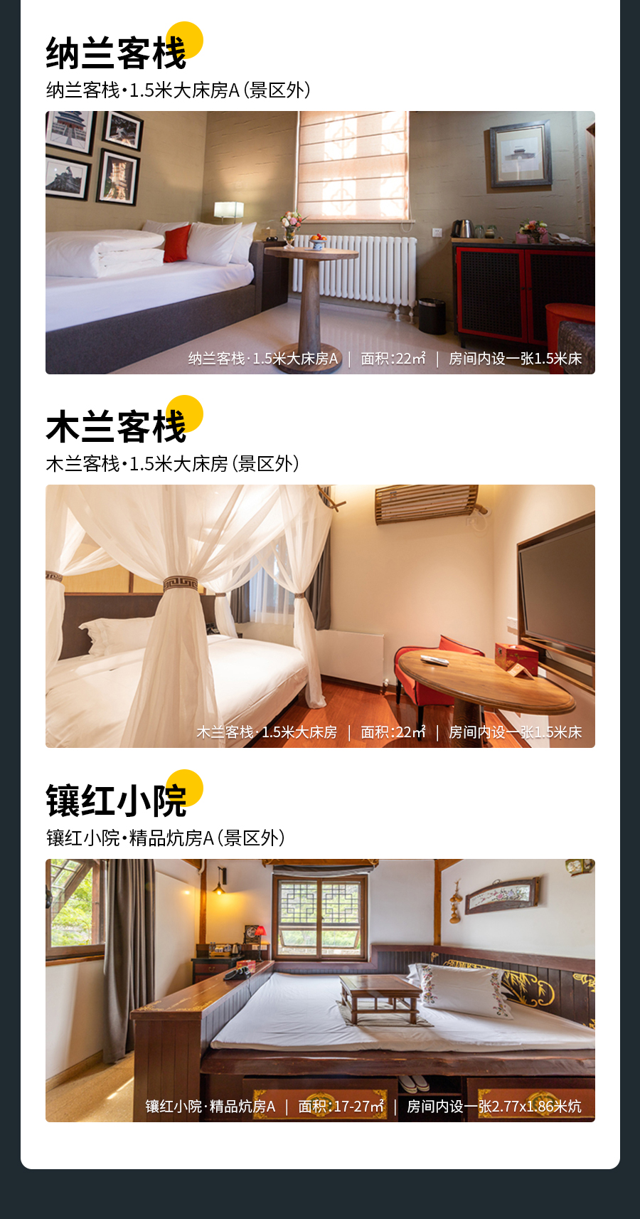 【秋促客栈通兑】古北水镇客栈1间1晚+古北水镇门票2张+通关文牒1册/文创雪糕2个/烤红薯2个(3选1)+早餐2份+入住期间无限次摆渡车乘坐 房型随机安排:圆通塔寺禅房双床房/圆通塔寺禅房1.8米大床房/英华1.5米大床房/雁门1.5米大床房/永顺1.5米大床房/永顺双床B/得月楼炕房/古寨1.5米炕房/洗尘1.5米炕房/纳兰1.5米大床房A(景区外)/木兰客栈1.5米大床房(景区外)/镶红精品炕房A(景区外)