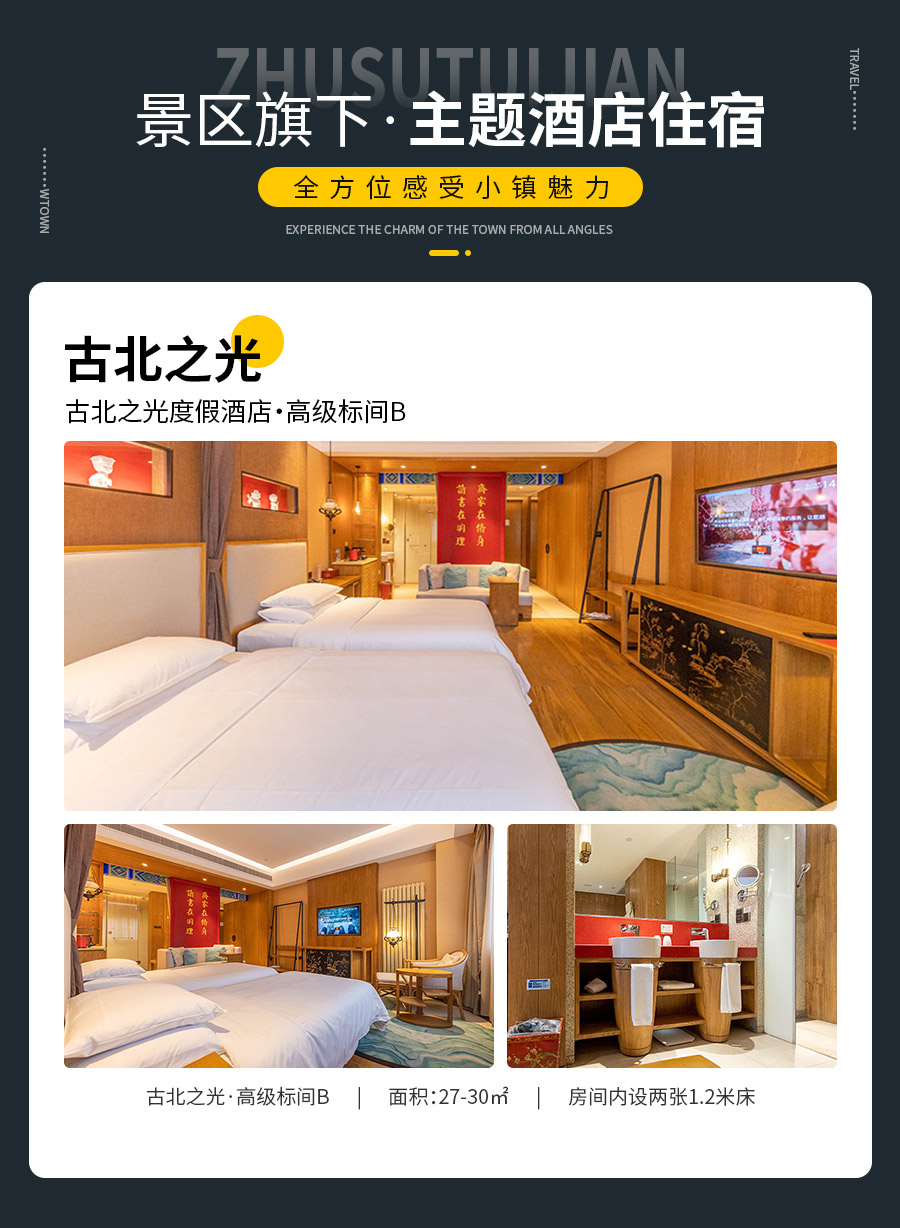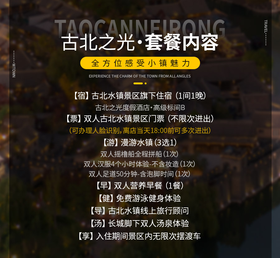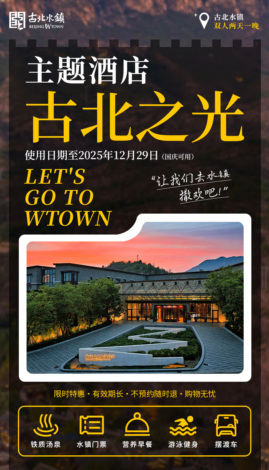 【秋促古北之光】古北之光高级标间B1间1晚+古北水镇门票2张+汤泉票2张+双人全程游船(拼船1次)/双人汉服体验不含妆造1次(4个小时)/双人足道50分钟含泡脚时间1次 (3选1)+早餐2份+古北之光免费游泳、健身房体验+线上旅行顾问+入住期间无限次摆渡车乘坐