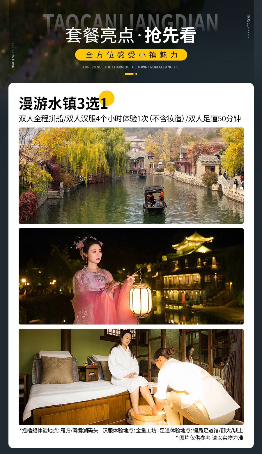 1、此价格基于2成人价格核算,1.5 米以下儿童根据实际项目情况补差;游船停航之后为双人汉服体验不含妆造1次(4个小时)/双人足道50分钟含泡脚时间(2选1项目),金鱼工坊汉服租赁需另付押金 500-800 元;营业时间 9:00-22:00,需闭店前归还汉服.(营业时间后期可能会有调整,请以当天实际营业时间为准)