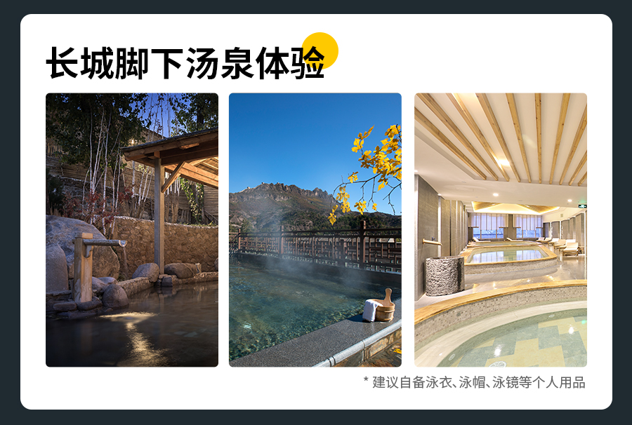 3、汤泉、泳池体验需要自备泳衣、泳帽、泳镜等个人用品,也可在体验处购买,需要预约使用;