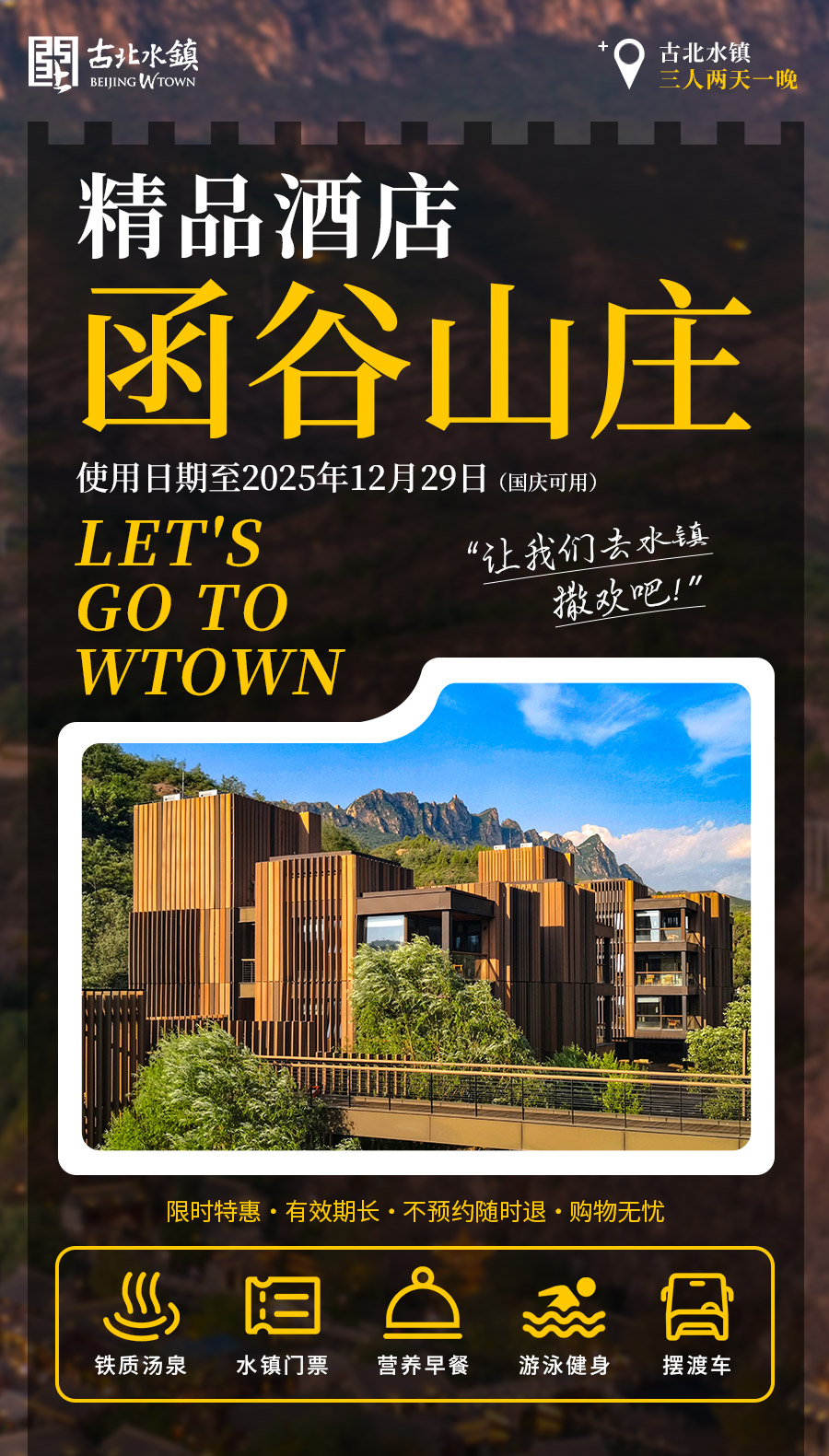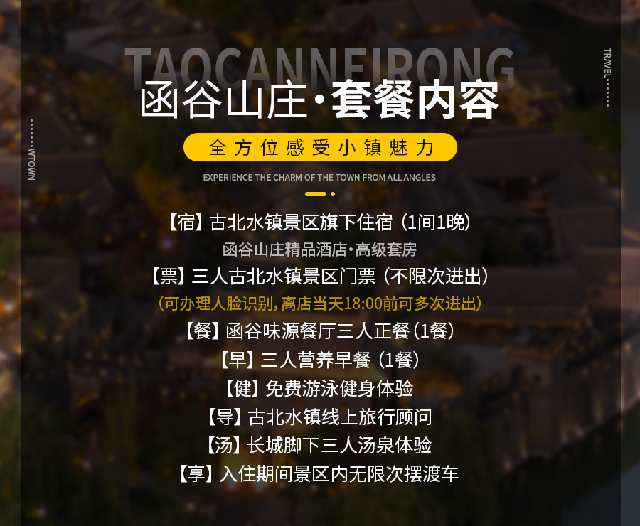【秋促函谷】函谷高级套房1间1晚+古北水镇门票3张+汤泉票3张+函谷3人正餐1份+早餐3份+线上旅行顾问+古北之光免费游泳、健身房体验+入住期间无限次摆渡车乘坐