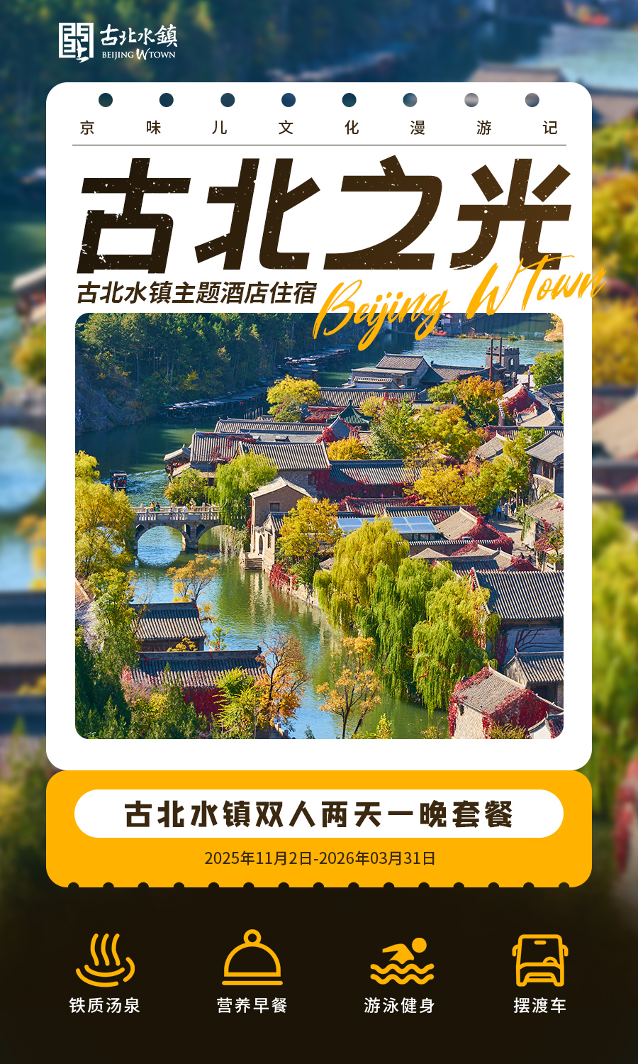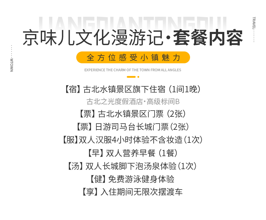 古北之光高级标间B住宿1间1晚+古北水镇门票2张+日游长城门票2张+汤泉票2张+双人汉服体验不含妆造1次(4个小时)+早餐2份+入住期间无限次摆渡车乘坐(日游长城开放时间9:00-17:00,截止检票时间16:10,清山时间16:30)