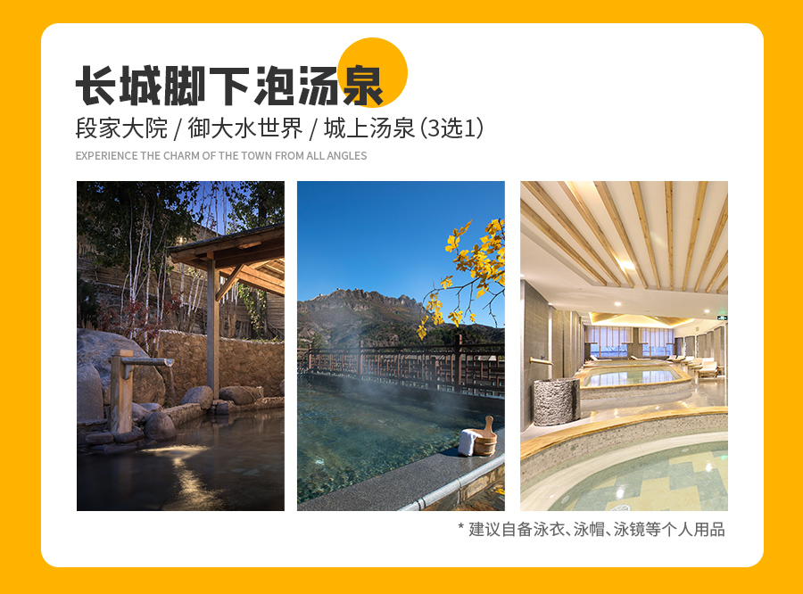3、汤泉、泳池体验需要自备泳衣、泳帽、泳镜等个人用品,也可在体验处购买,汤泉为入住期间有效,使用地点为景区内当天开放汤泉馆,汤泉开放情况以当天景区确认为准,凡是有泡汤需求客人需先预约。