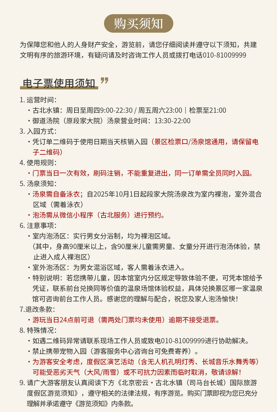 费用包含御道汤院汤泉票1张+赠古北水镇门票1张
