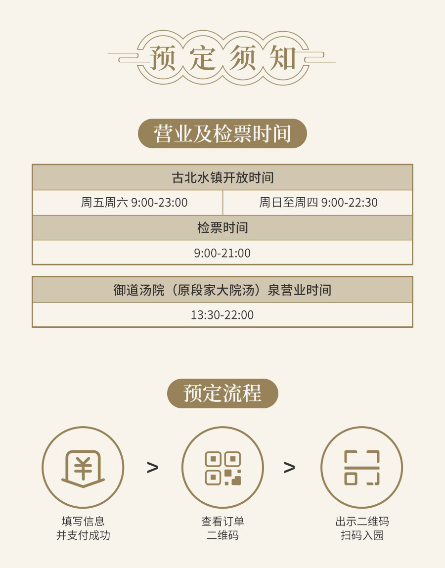 开放时间古北水镇:周日至周四 9:00-22:30|周五周六 9:00-23:00(22:00停止检票) ;御道汤院营业时间:13:30-22:00