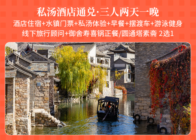 水镇大酒店高级标间住宿1间2晚+古北水镇门票2张+童玩馆2大1小含小食/青叶水吧双人下午茶/水镇大酒店双人下午茶/半程游船拼船票2张(4选1)+早餐2份+汤泉票2张+水镇大酒店免费游泳、健身房体验+入住期间无限次摆渡车乘坐
