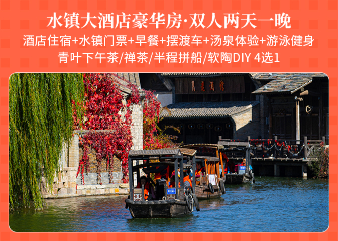 水镇大酒店豪华大床/豪华标间住宿1间1晚+古北水镇门票2张+双人青叶水吧下午茶/半程拼船票2张/双人圆通塔禅茶/软陶DIY体验2份(4选1)+早餐2份+汤泉票2张+水镇大酒店免费游泳、健身房体验+入住期间无限次摆渡车乘坐