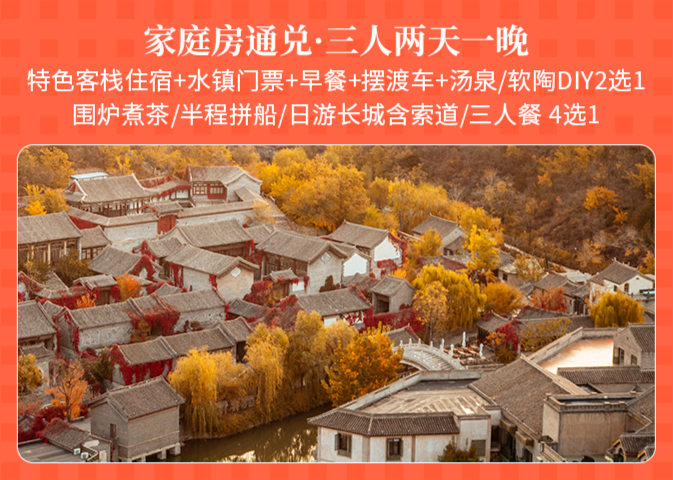 客栈家庭房1间1晚+古北水镇门票3张+三人威廉围炉煮茶/3人半程游船(拼船)/三人日游长城+往返索道/火锅店3人餐(4选1)+汤泉票3张/软陶DIY体验2份(2选1)+早餐3份+入住期间无限次摆渡车乘坐