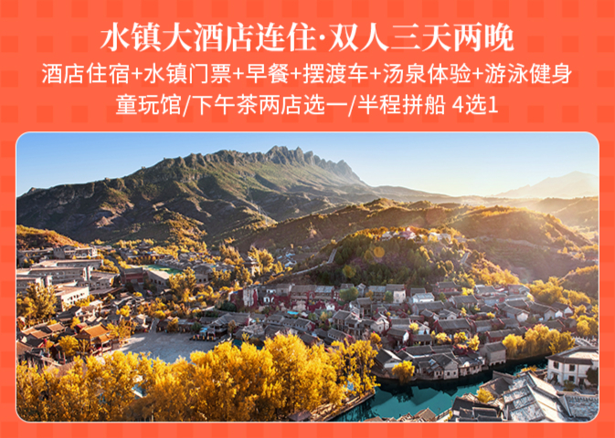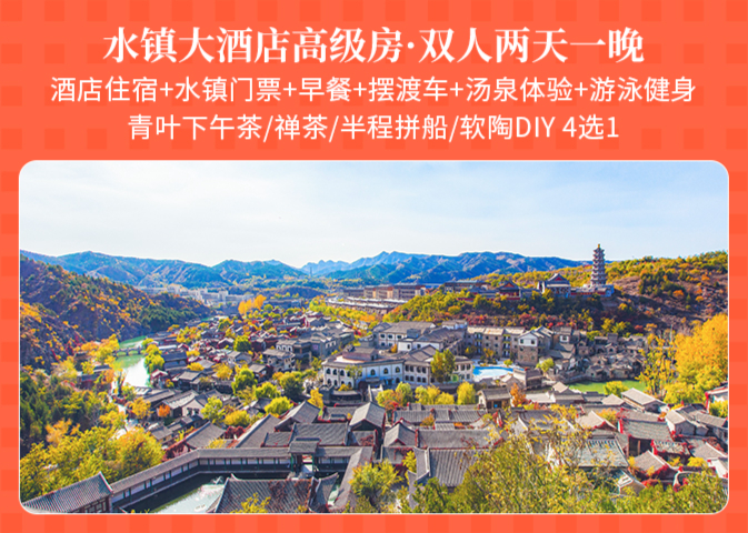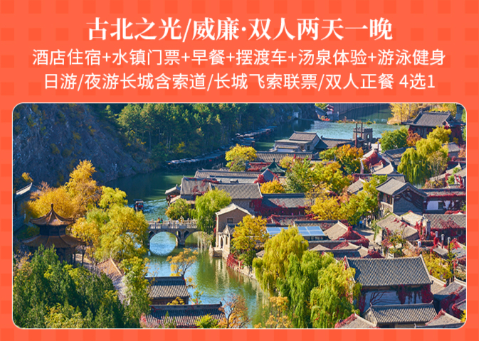 水镇大酒店豪华标间/豪华大床1间1晚+古北水镇门票2张+双人正餐/日游长城(含往返索道)/夜游长城(含往返索道)(3选1)+早餐2份+汤泉票2张+线上旅行顾问+水镇大酒店免费游泳、健身房体验+入住期间无限次摆渡车乘坐