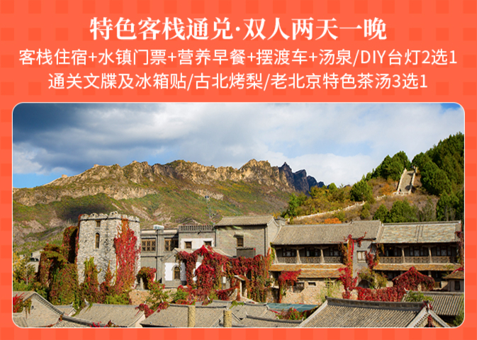 客栈住宿1间1晚+古北水镇门票2张+通关文牒1册+文创冰箱贴1个/烤梨2个/老北京特色茶汤2份(3选1)+汤泉票2张/DIY台灯1个(2选1)+早餐2份+入住期间无限次摆渡车乘坐