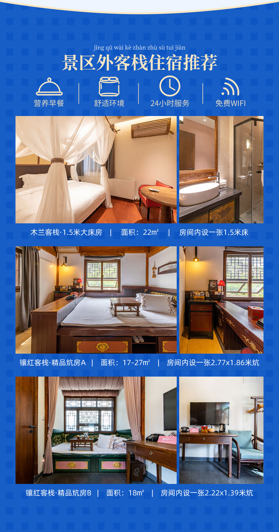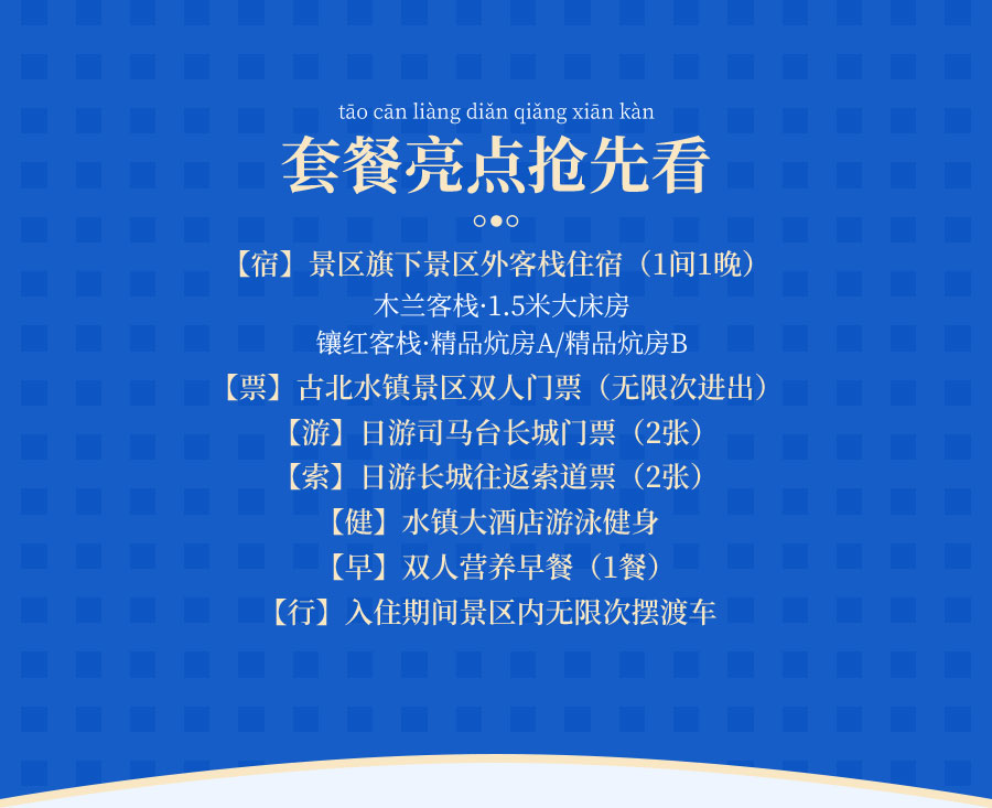 【景区外客栈通兑】木兰客栈1.5米大床房/镶红精品炕房A/B1间1晚+早餐2份+古北水镇景区门票2张+日游司马台长城票(含往返索道)2 张(位于景区外,入住期间可以办理人脸识别)房型不指定,随机安排