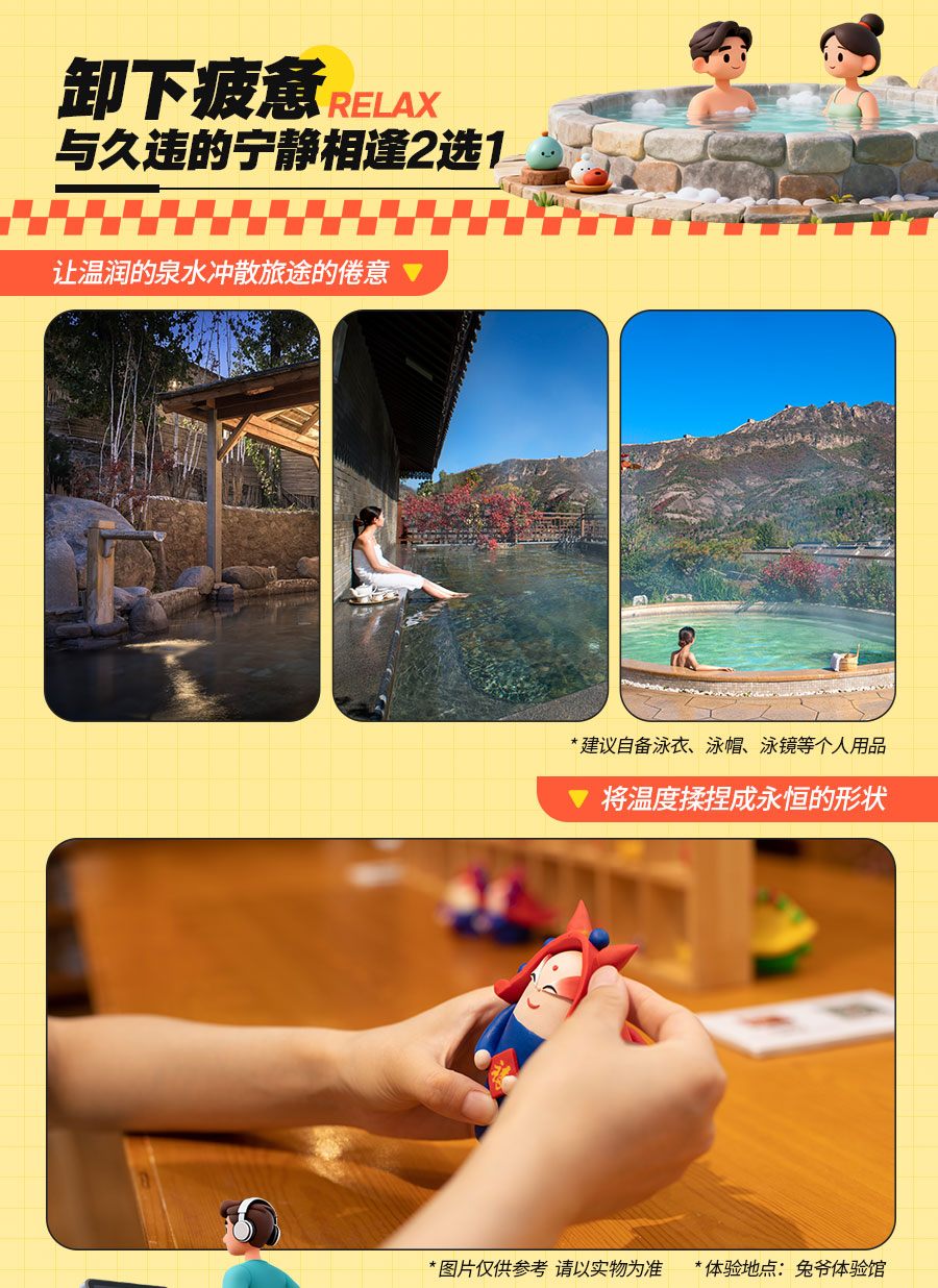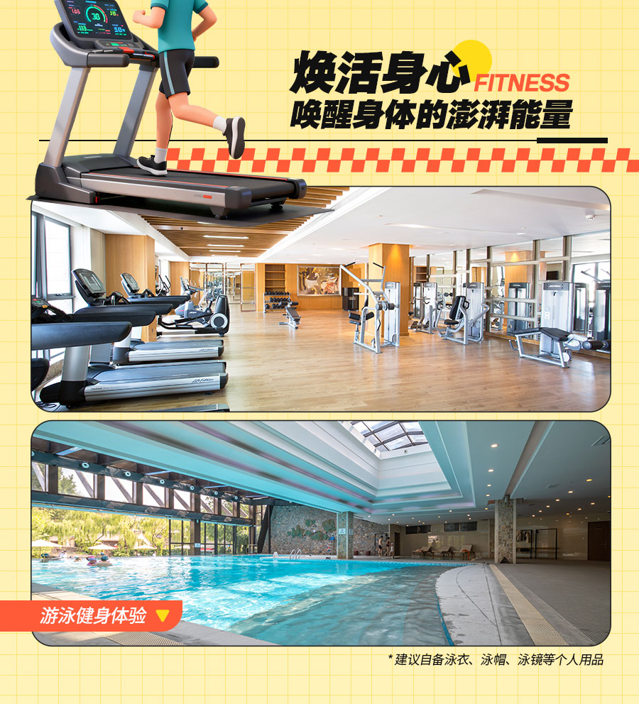2、汤泉、泳池体验需要自备泳衣、泳帽、泳镜等个人用品,也可在体验处购买,汤泉为入住期间有效,使用地点为景区内当天开放汤泉馆,汤泉开放情况以当天景区确认为准,凡是有泡汤需求客人需先预约。