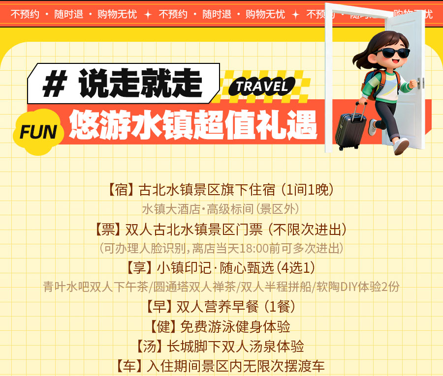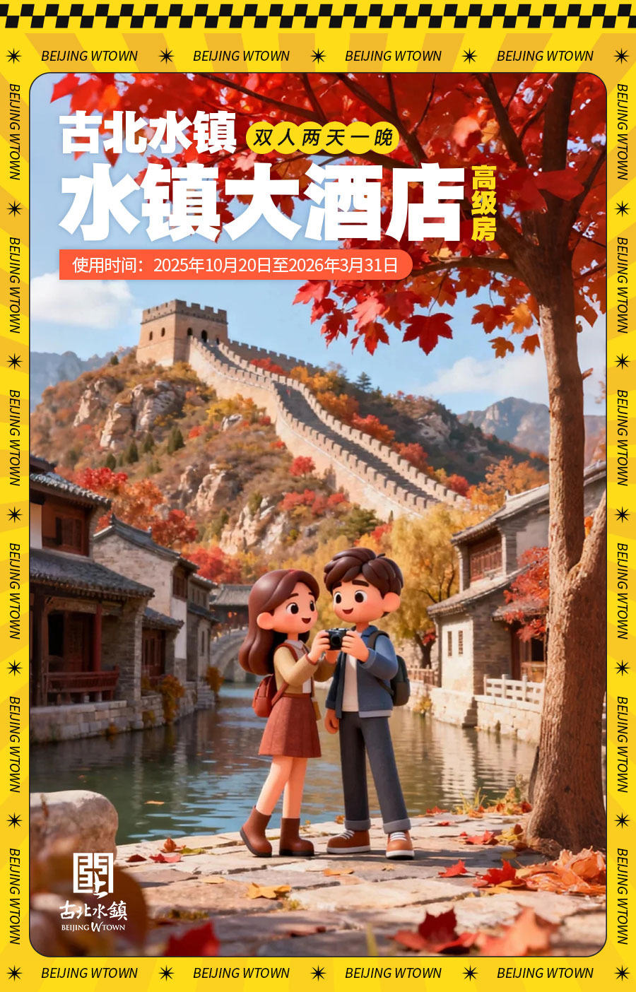 【25双11 水镇大酒店高级标间】水镇大酒店高级标间1间1晚+古北水镇门票2张+双人青叶水吧下午茶/半程拼船票2张/双人圆通塔禅茶/软陶DIY体验2份(4选1)+早餐2份+汤泉票2张+水镇大酒店免费游泳、健身房体验+入住期间无限次摆渡车乘坐