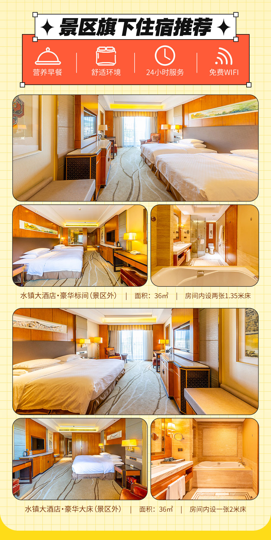 6、由于景区酒店均为特色酒店,空间大小各不相同,图片仅供参考,若因酒店维保休整,景区将为您调整房间至与您预订酒店同等级的酒店客房入住,感谢配合。
