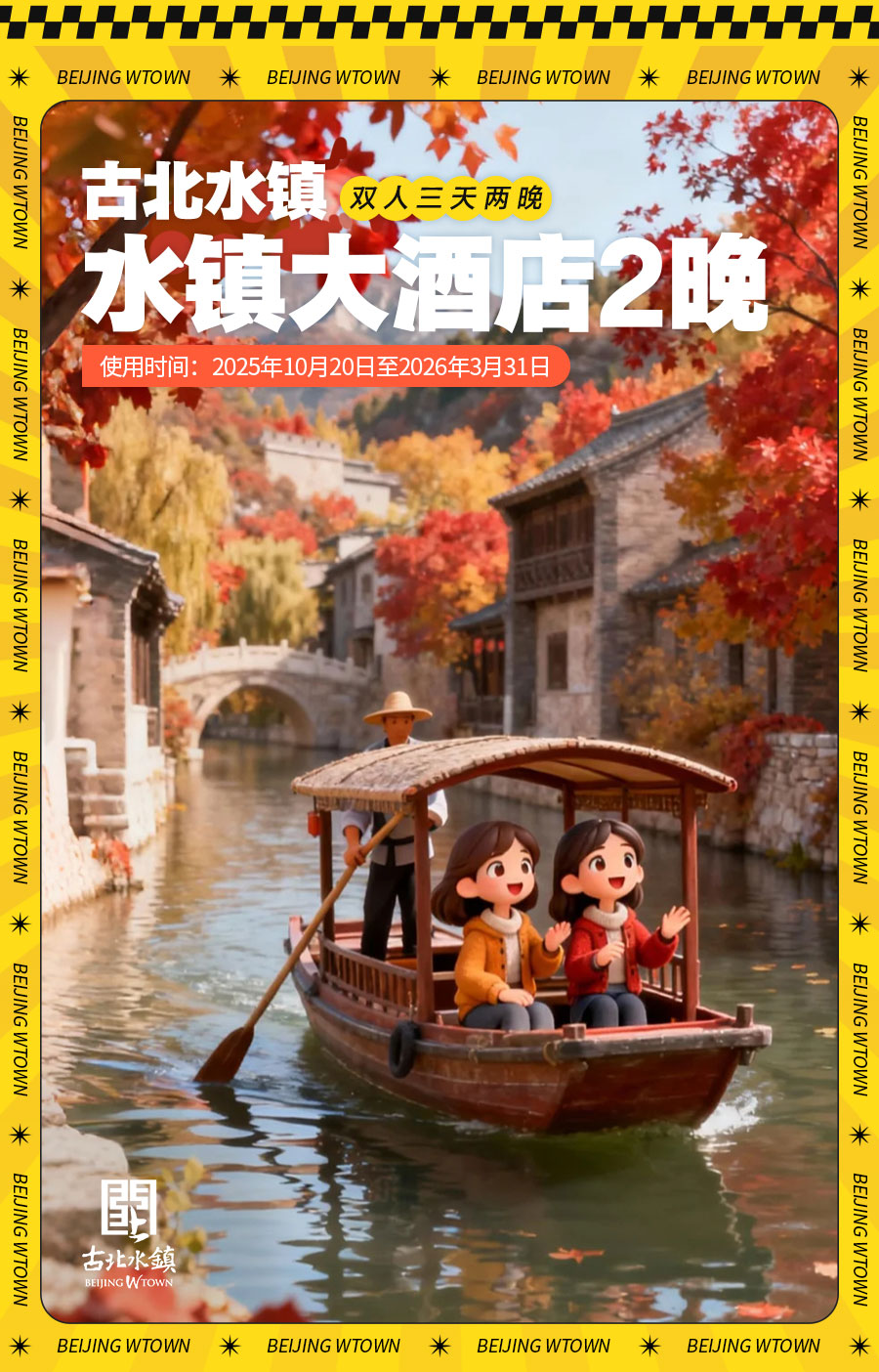 【25双11 水镇大酒店2晚】水镇大酒店高级标间住宿1间2晚(连住)+古北水镇门票2张+童玩馆2大1小含小食/青叶水吧双人下午茶/水镇大酒店双人下午茶/半程游船拼船票2张(4选1)+早餐2份+汤泉票2张+水镇大酒店免费游泳、健身房体验+入住期间无限次摆渡车乘坐