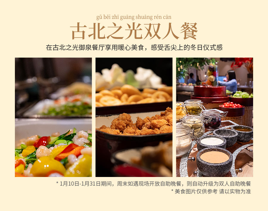 3、古北之光双人餐:1月10日-1月31日期间,周末如遇现场开放自助晚餐,则自动升级为双人自助晚餐,用餐时间为 17:00-20:30。