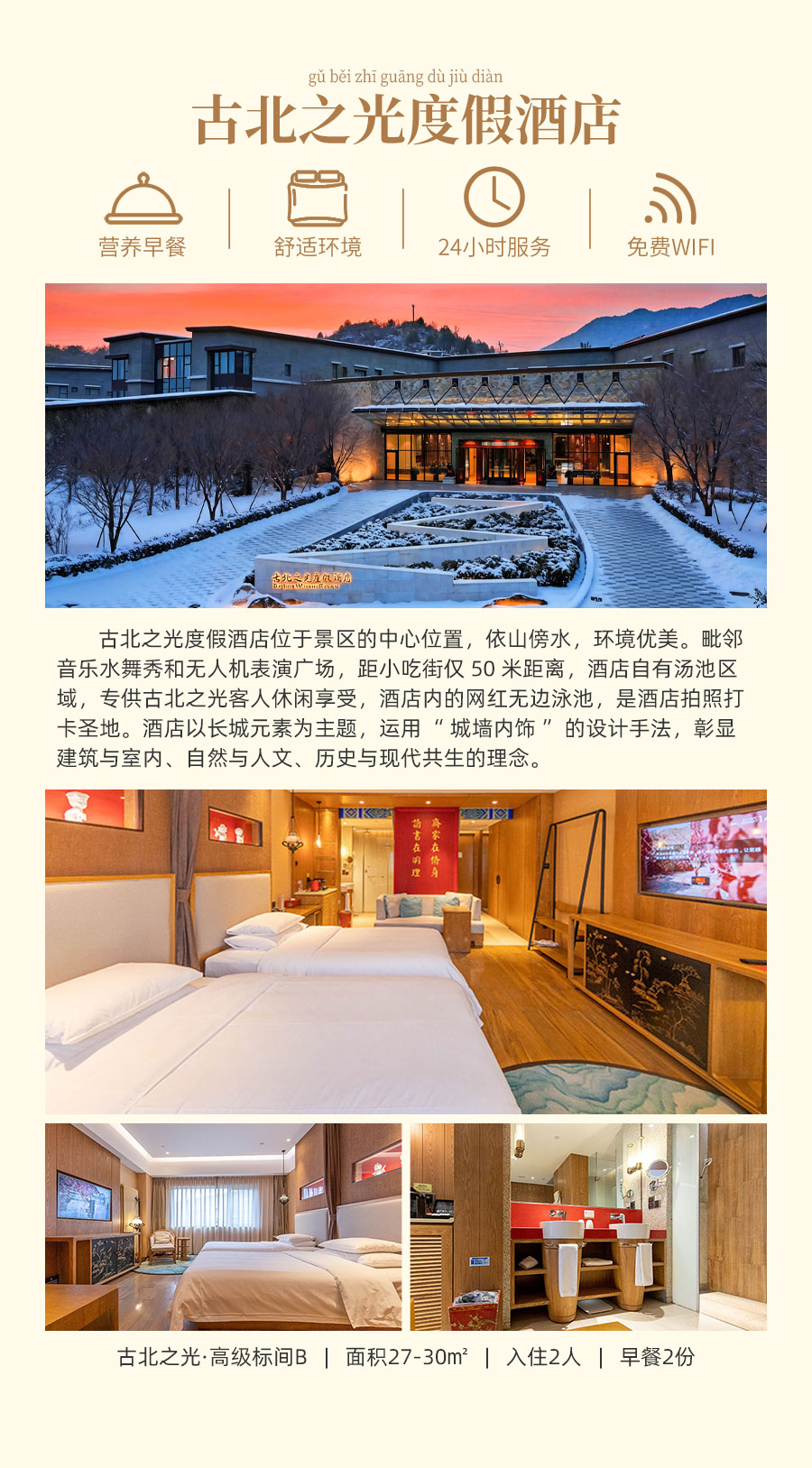 【枕梦星河】古北之光高级标间B1间1晚+古北水镇门票2张+古北之光双人餐+汤泉票2张+早餐2份+入住期间无限次摆渡车乘坐(26年2月15日-2月23日不可用)