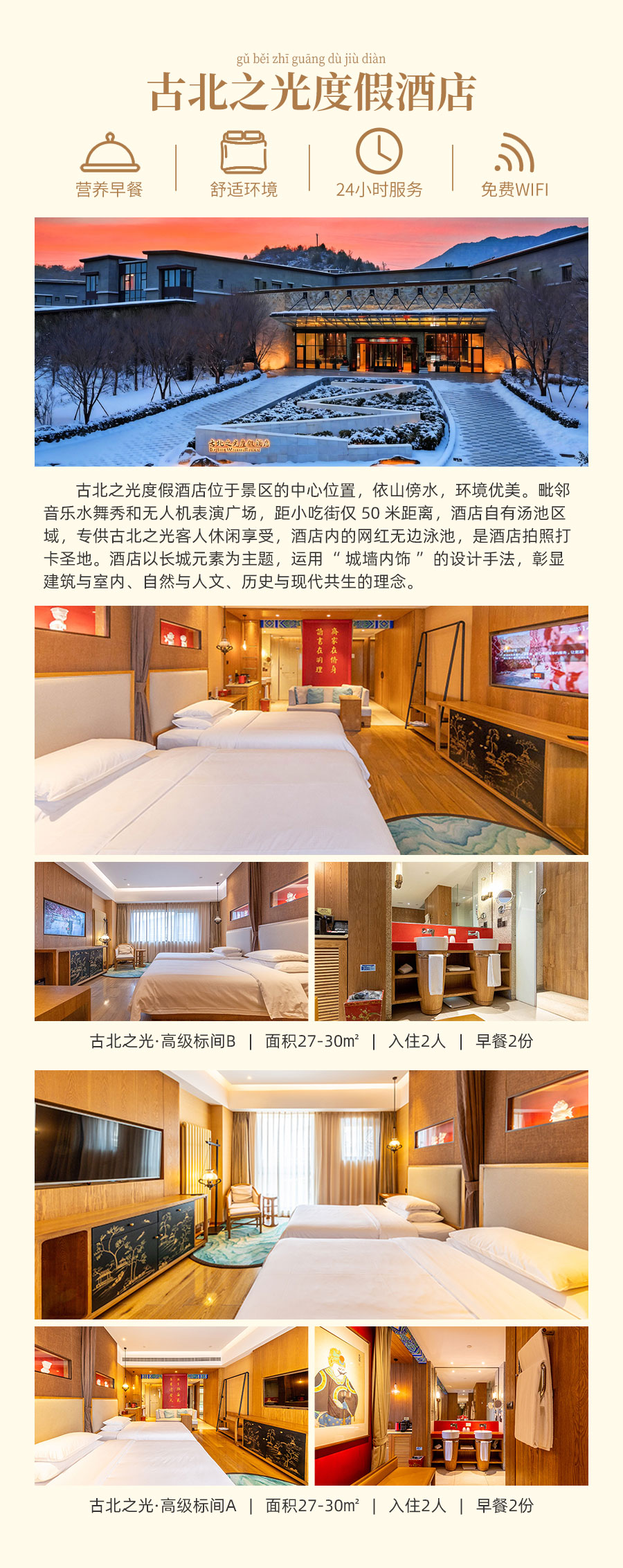【枕梦星河】古北之光高级标间B/高级标间A 1间1晚+古北水镇门票2张+古北之光双人餐+汤泉票2张+早餐2份+入住期间无限次摆渡车乘坐(26年2月15日-2月23日不可用)