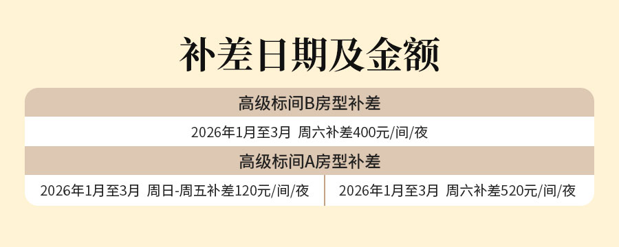 2、此价格为淡季非周末价格,2026年1月3日及2月14日无需补差,高级标间B26年1-3月周六补差400元/间/夜。高级标间A26年1-3月周日-周五补差120元/间/夜,高级标间A 26年1-3月周六补差520元/间/夜。2026年2月15日-2月23日(春节期间)不可用;若需预约2月14日出行,可先预约非周末日期,在联系客服把订单改期至2月14日。