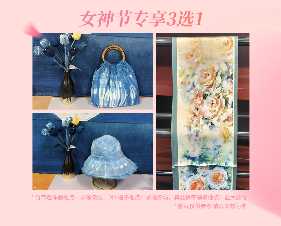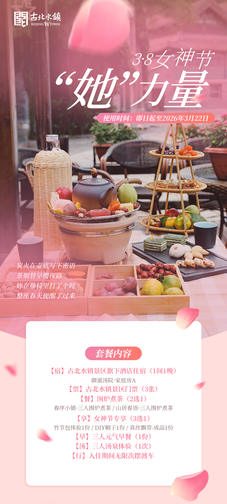 【“她”力量女神节专属】御道汤院家庭房A1间1晚+古北水镇门票3张+春序小镇·3人围炉煮茶/山居春语·3人围炉煮茶 1份( 2选1)+永顺染坊竹节包体验/永顺染坊DIY 帽子/益大丝号真丝飘带 1份(3选1)+汤泉票3张+三人早餐1次+入住期间无限次摆渡车乘坐