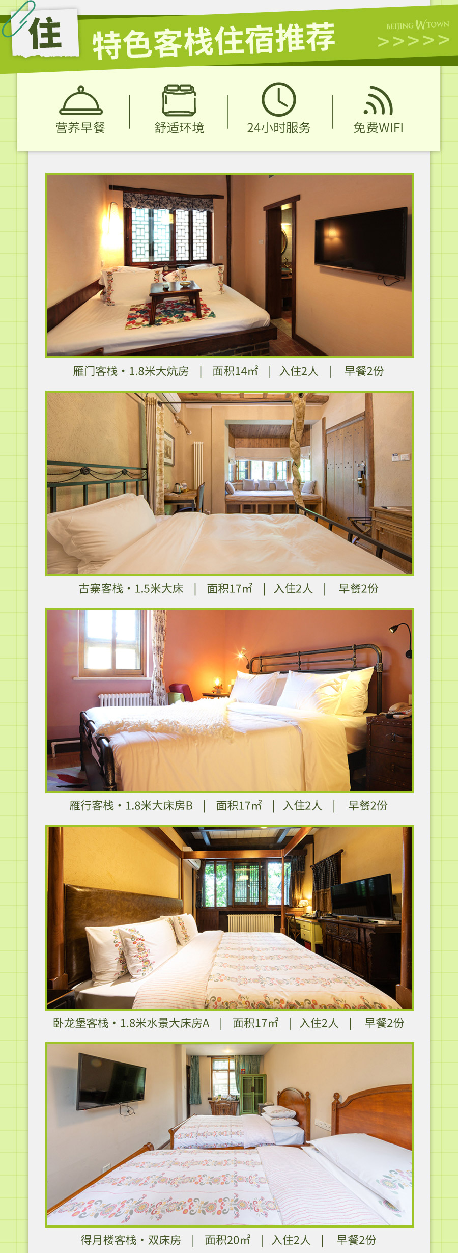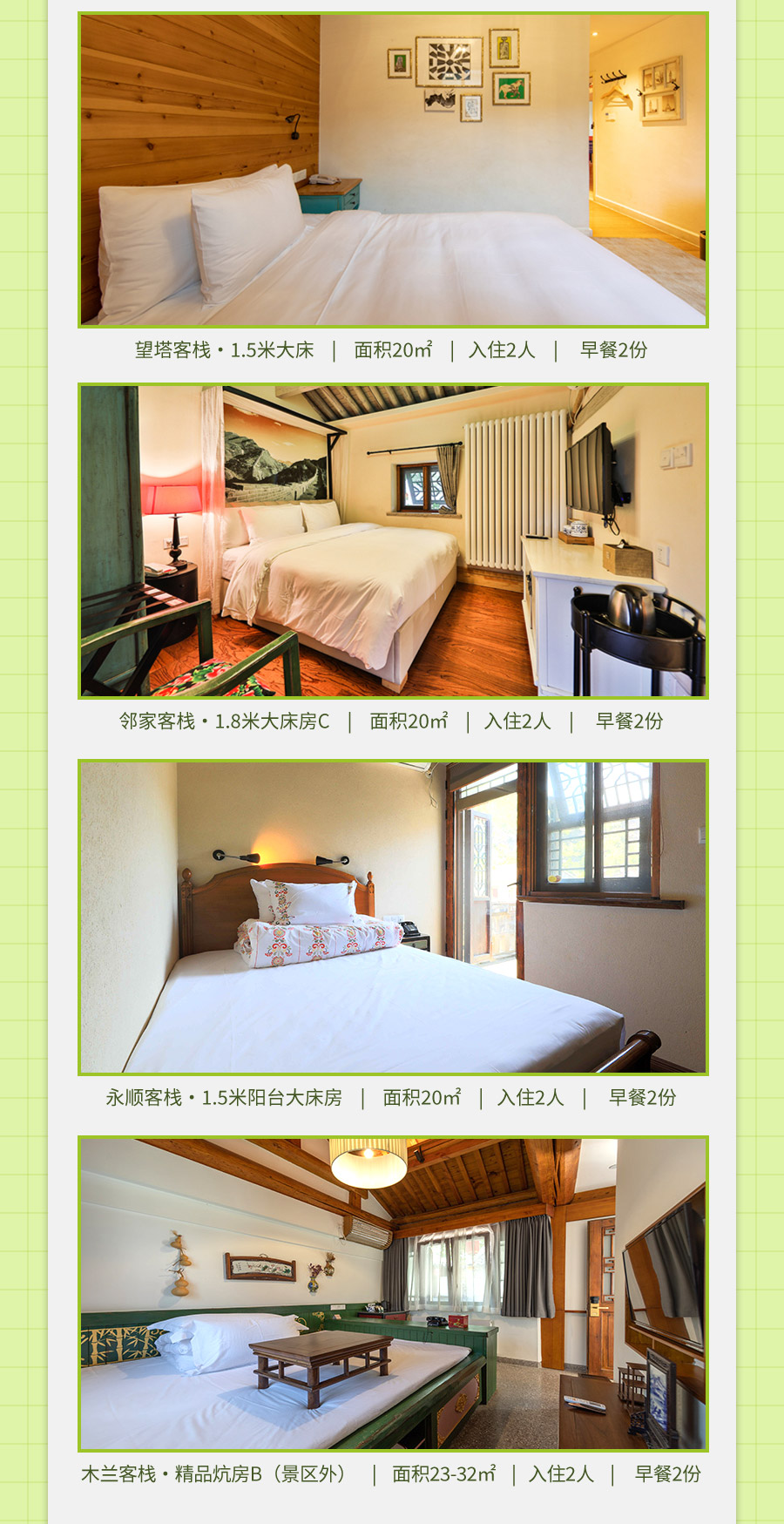 5、套餐包含房型:雁门1.8米大炕房/双床房/古寨1.5米大床/雁行1.8米大床房B/卧龙堡1.8米水景大床房A/水景双床房/1.5米水景阳台大床/得月楼双床房/望塔1.5米大床/青叶1.5米大床/邻家1.8米大床房C/英华1.5米阳台大床房/永顺1.5米阳台大床房/木兰精品炕房B(景区外)房型随机安排。