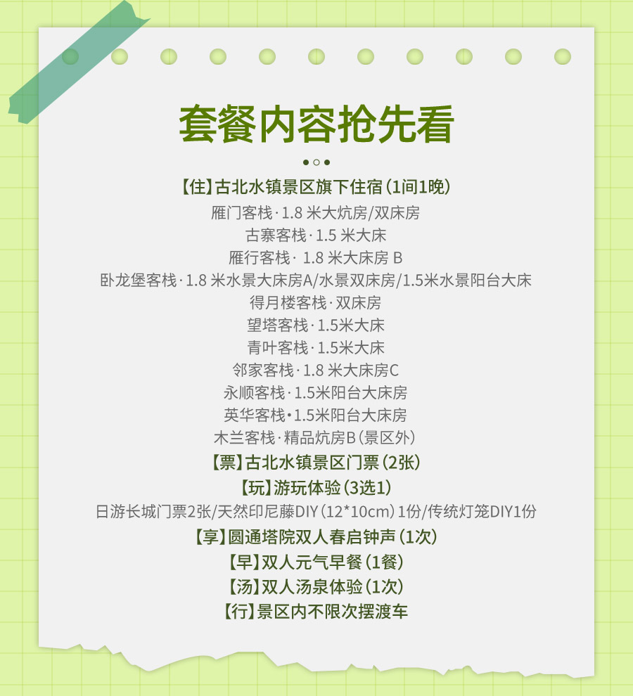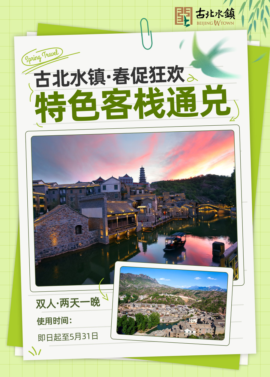 【春促客栈通兑】客栈住宿1间1晚+古北水镇门票2张+汤泉票2张+日游司马台长城门票2张/天然印尼藤DIY (12cm*10cm)1个/传统灯笼DIY 1个(3选1)+双人春启钟声1次+早餐2份+入住期间无限次摆渡车乘坐。套餐房型随机安排:雁门1.8米大炕房/双床房/古寨1.5米大床/雁行1.8米大床房B/卧龙堡1.8米水景大床房A/水景双床房/1.5米水景阳台大床/得月楼双床房/望塔1.5米大床/青叶1.5米大床/邻家1.8米大床房C/英华1.5米阳台大床房/永顺1.5米阳台大床房/木兰精品炕房B(景区外)