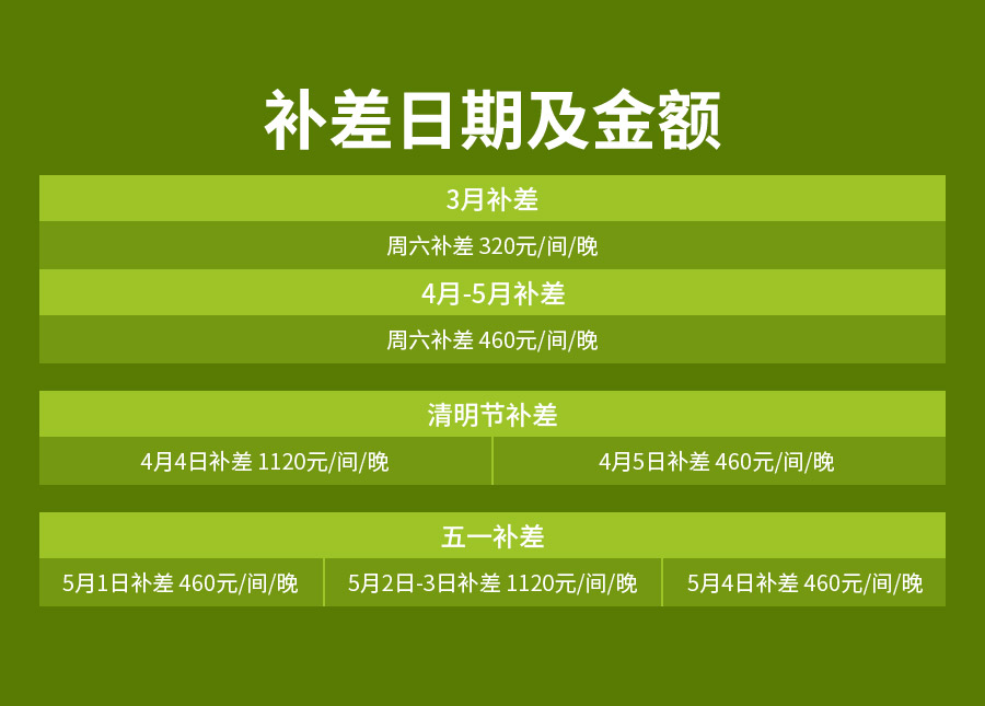 2、此套餐按照淡季非周末进行核算,具体补差规则如下:2026月2月-3月周六补差320元/间/晚;4-5月周六补差460元/间/晚;清明4月3日、4月6日不补差,4月4日补差1120元/间/晚,4月5日补差460元/间/晚;4月30日、5月5日不补差,5月1日、5月4日补差460元/间/晚,5月2日-5月3日补差1120元/间/晚;