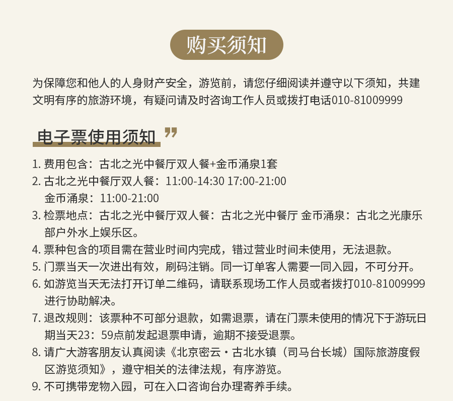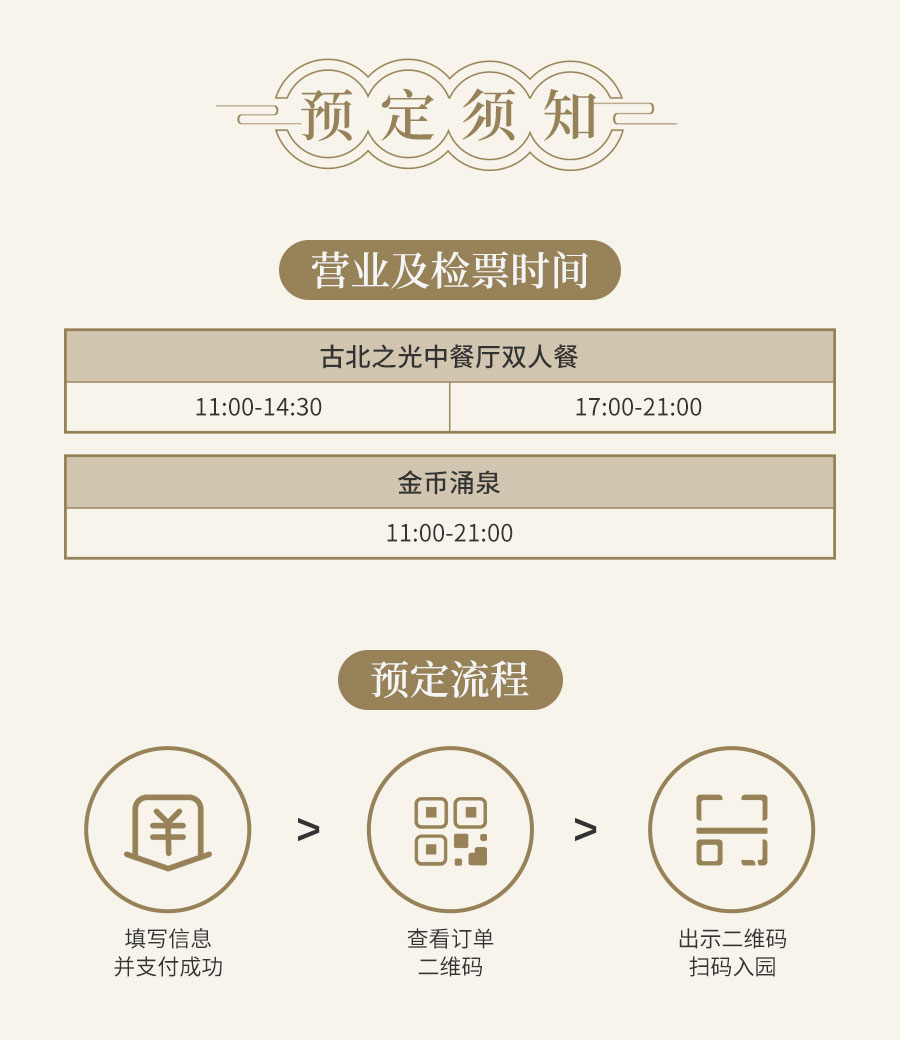 费用包含流光漫夏双人餐:古北之光中餐厅双人餐+金币涌泉1套