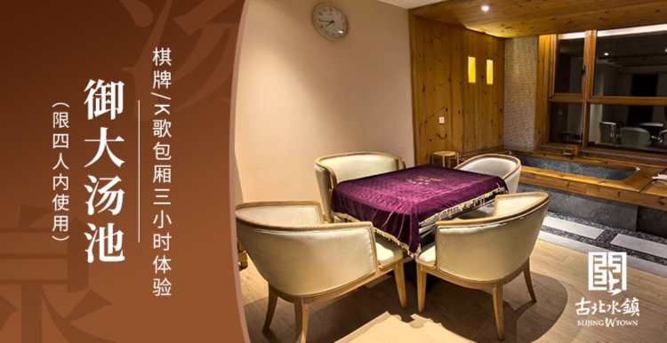 费用包含【不含水镇】御大汤池棋牌/K歌包厢3小时,麻将/掼蛋/K歌包厢3选1,包厢内无私汤